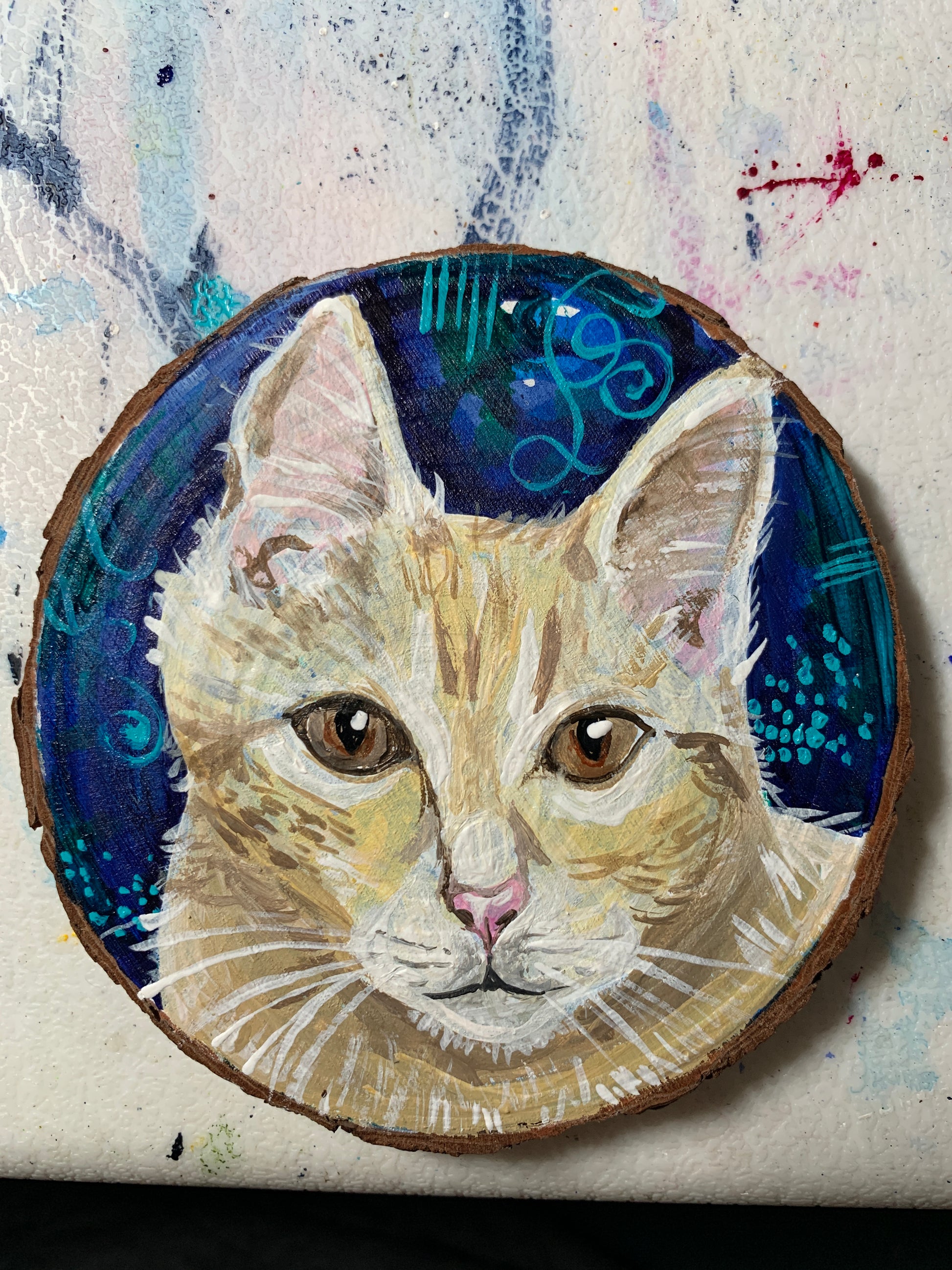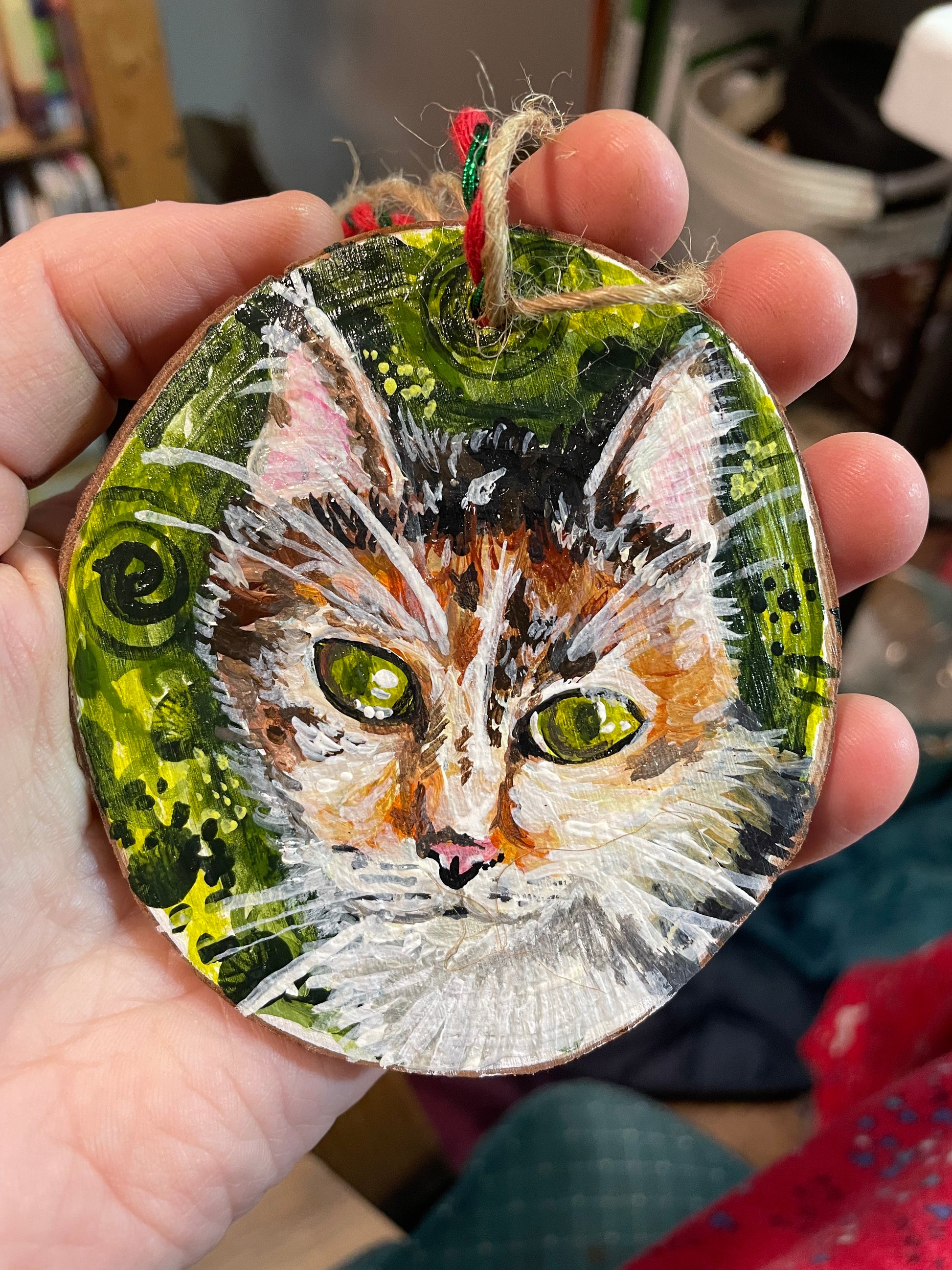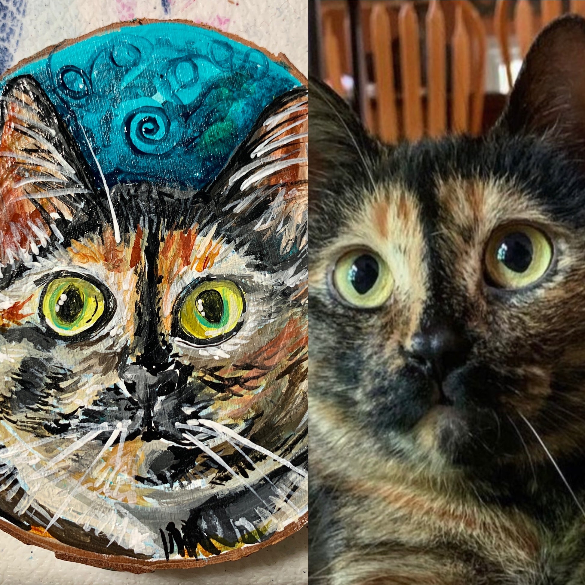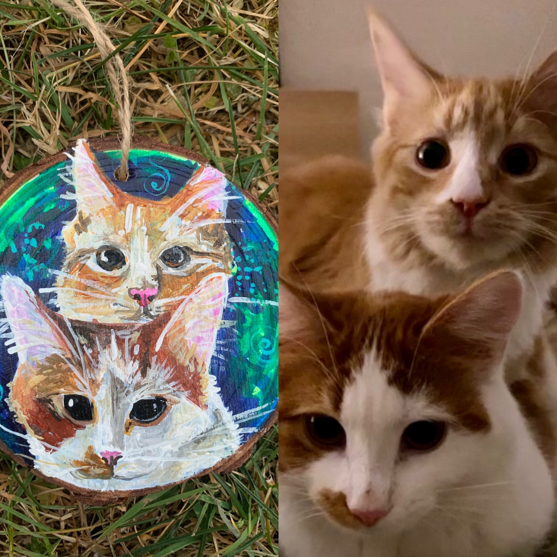These wooden ornaments are completely customizable-you send me pictures of your pet cat or dog (or goat, llama, lizard...) and choose the background color and I will paint a custom portrait with acrylic paint!