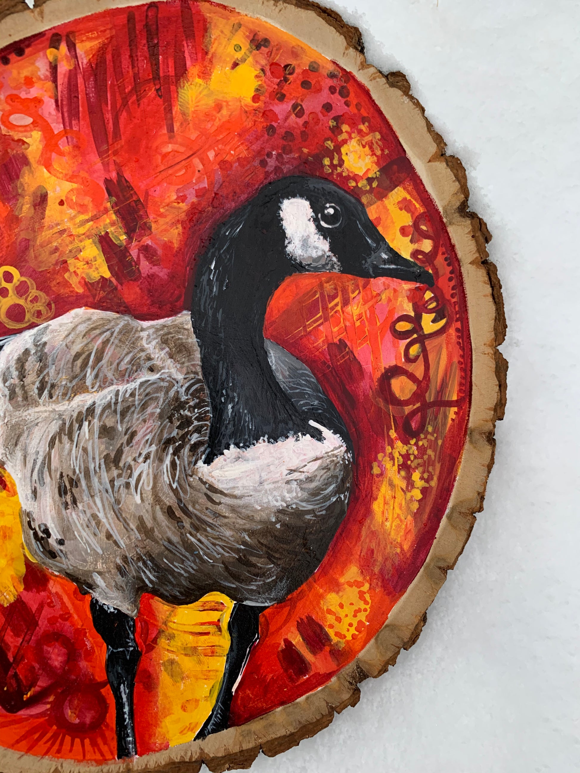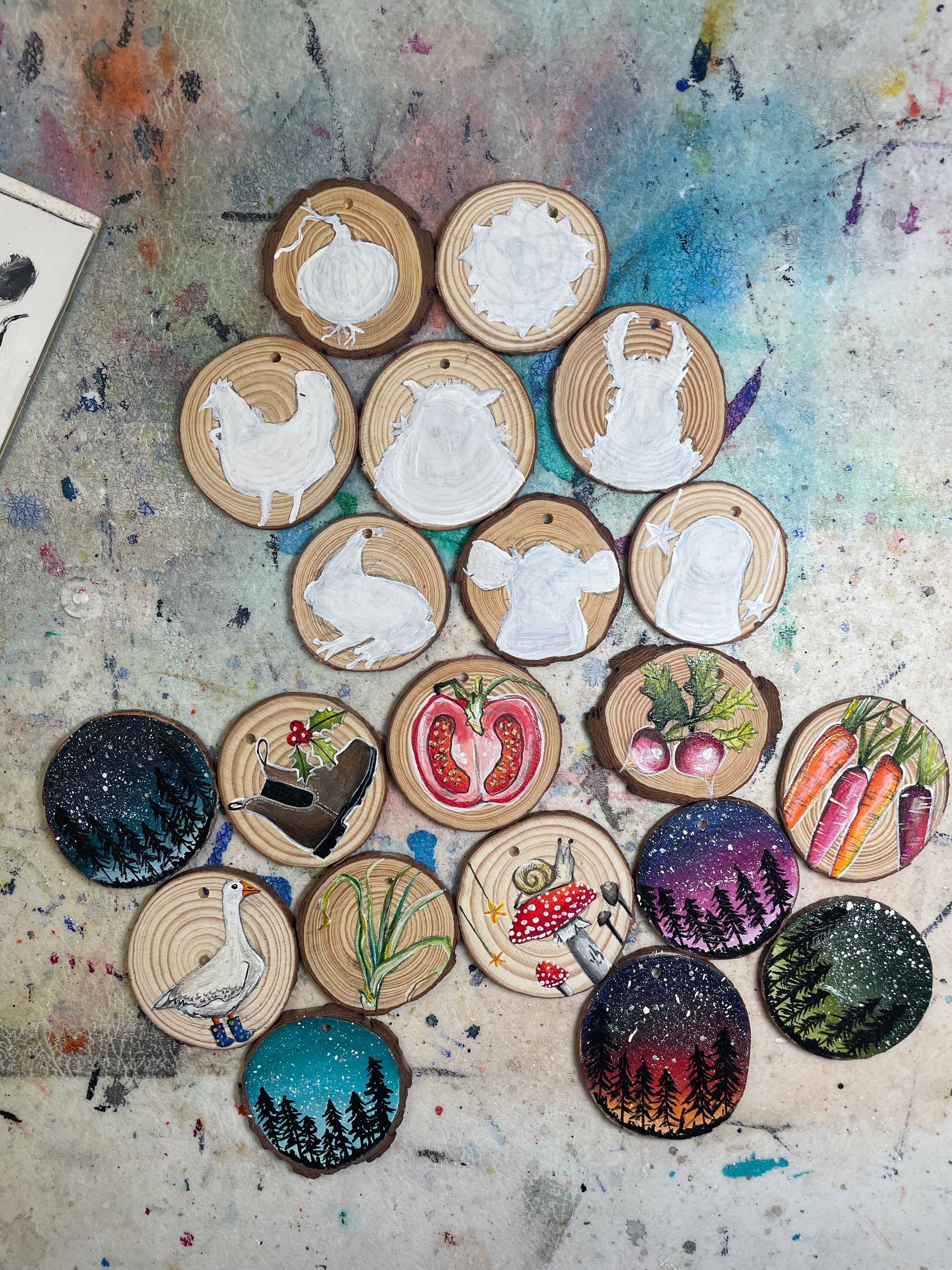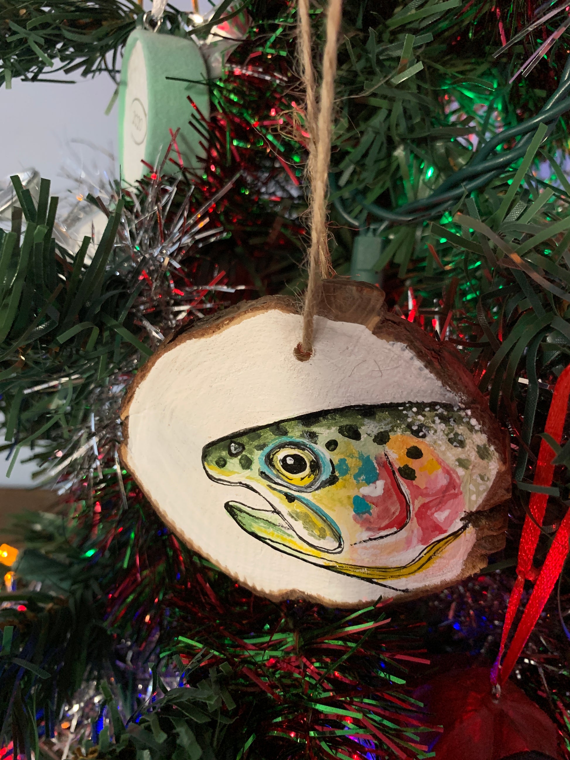 The wooden slices have natural bark and range in size, but are approximately 4.5-5” in diameter and come ready to hang with a drilled hole and strung with twine. They are also sealed with clear varnish to protect them from moisture and humidity, and signed on the back.
